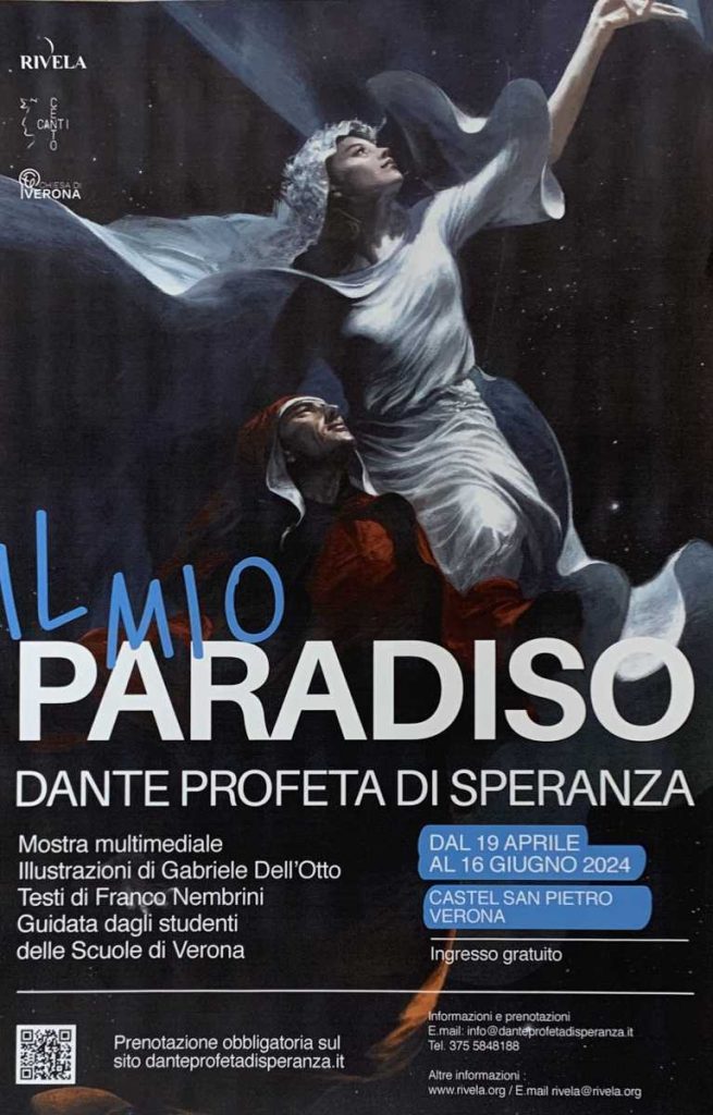 La rassegna, che segue “Il mio Inferno” del 2022, e “Il mio Purgatorio” del 2023, è organizzata da Associazione Rivela con il patrocinio di Regione Veneto, Comune di Verona, Società Dante Alighieri Verona, Ministero dell’Istruzione – Ufficio Scolastico Territoriale di Verona, Confcommercio Verona, Confindustria Verona Gruppo Giovani, Camera di Commercio di Verona, Cdo Veneto, Ordine dei Dottori Commercialisti e degli Esperti Contabili di Verona, Iusve e Agesc – Associazione Genitori Scuole Cattoliche di Verona, Agec.