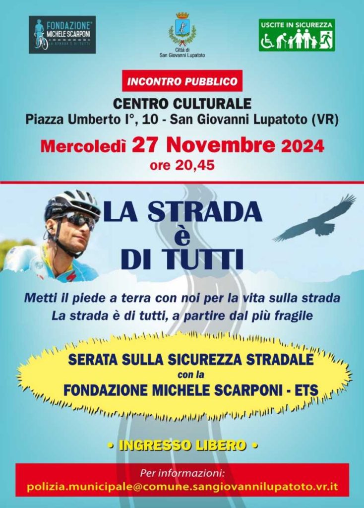 Si svolgerà mercoledì 27 novembre, alle ore 20,45 nella sala civica del centro culturale di Piazza Umberto I° a San Giovanni Lupatoto (VR), l’incontro pubblico dal titolo “La strada è di tutti”, organizzato dall’assessorato alla Sicurezza del Comune di San Giovanni Lupatoto nell’ambito del progetto “Uscite in Sicurezza”, in collaborazione con la Fondazione Michele Scarponi, allo scopo di sensibilizzare la cittadinanza sulle tematiche della sicurezza stradale, essendo questo aspetto, assieme con le infrastrutture dedicate, uno strumento necessario per arrivare ad avere dei comportamenti corretti sulla strada.