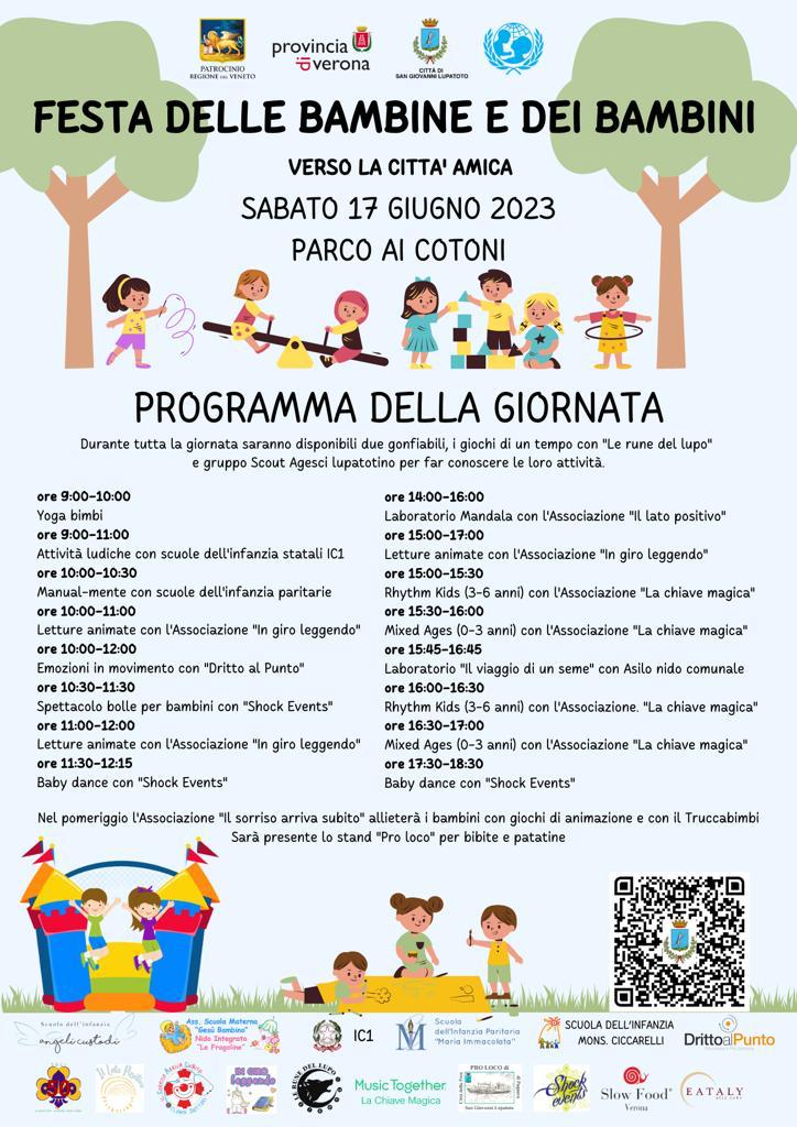 Durante la festa si alterneranno attività, laboratori ed animazione per tutti le bambine e i bambini con lo yoga bimbi, le letture animate anche per i piccolissimi, progetti musicali, baby dance e spettacoli dedicati. Due gonfiabili saranno a disposizione per rendere più festosa la giornata oltre alla presenza dello stand della Proloco per bibite e patatine. Molte saranno le associazioni lupatotine presenti che si sono offerte di restituire qualche attività dedicata alle bambine e ai bambini come “Le Rune del Lupo” e i giochi di un tempo per conoscere e imparare a divertirsi con i giochi di legno, “Il Sorriso arriva subito” con il trucca bimbi e l’animazione con i palloncini colorati e “Il lato positivo” con i mandala della natura. Sono coinvolte in laboratori dedicati anche le tre scuole dell’infanzia paritarie e statali del territorio che contribuiscono a rendere più attrattiva la festa, mentre un gruppo di scout si occuperà della sicurezza e di far conoscere la realtà di volontariato giovanile.