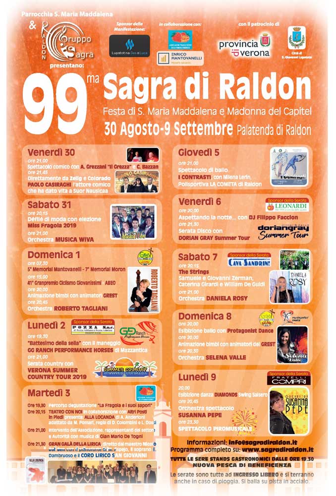 Venerdì 30 Agosto si accenderanno i riflettori sulla 99^ Sagra di Raldon presso il Centro Comunitario in via S. Giovanni Bosco.