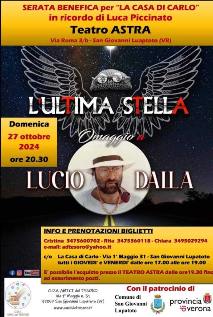 Per festeggiare i propri 20 anni e per sostenere “La Casa di Carlo” (casa famiglia per le persone disabili) l’associazione AMICI DEL TESORO O.D.V. organizza il giorno 27 ottobre 2024 ore 20,30 al Teatro Astra di San Giovanni Lupatoto, il concerto tributo a Lucio Dalla con la band L’Ultima Stella. Prima dell’inizio del concerto verrà ricordato Luca Piccinato attraverso la lettura di alcune sue poesie ed con l’ausilio di immagini.