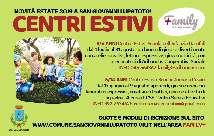 Si ricorda che sono aperte le iscrizioni per le attività FAMILY+ presso il CENTRO PER LA FAMIGLIA a CA’ SORIO che riprenderanno a settembre (i posti sono limitati!). Per INFORMAZIONI potete visitare il sito del Comune o chiamare il Punto Informativo FAMILY+ presso l’ufficio Servizi Sociali Comune di San Giovanni Lupatoto, nei giorni di martedì e giovedì dalle 10.00 alle 13.00. Tel. 045 8290132-045 8290195