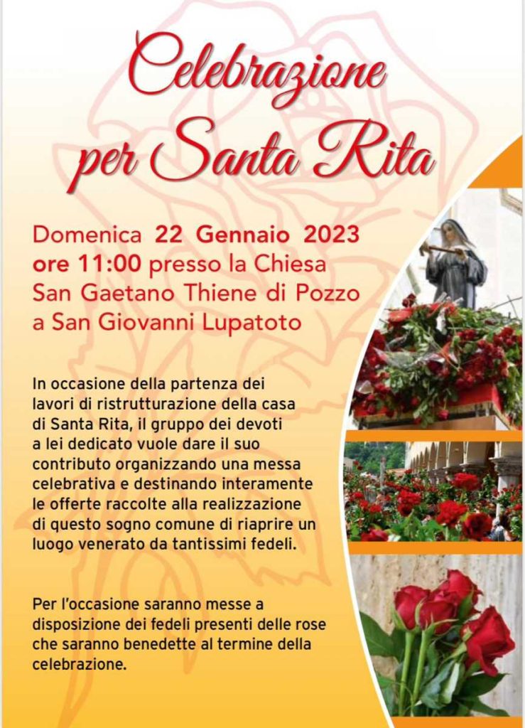 Domenica 22 gennaio nella Chiesa di San Gaetano di Pozzo viene celebrata alle ore 11 una Santa Messa in occasione della partenza dei lavori di ristrutturazione della Casa di Santa Rita, destinando interamente le offerte a soste gno di questo intervento. La Casa di Santa Rita è un progetto del Monastero Santa Rita da Cascia che accoglierà gratuitamente le famiglie che non possono pagare una sistemazione in affitto o un albergo, e garantirà la loro presenza ai malati. Si tratta di un appartamento di 240 mq, al 2° piano dell’Ospedale di Cascia, un centro specialistico d’eccellenza a livello nazionale. Per l’occasione saranno messe adisposizione dei fedeli presenti delle rose che saranno benedette al termine della celebrazione.