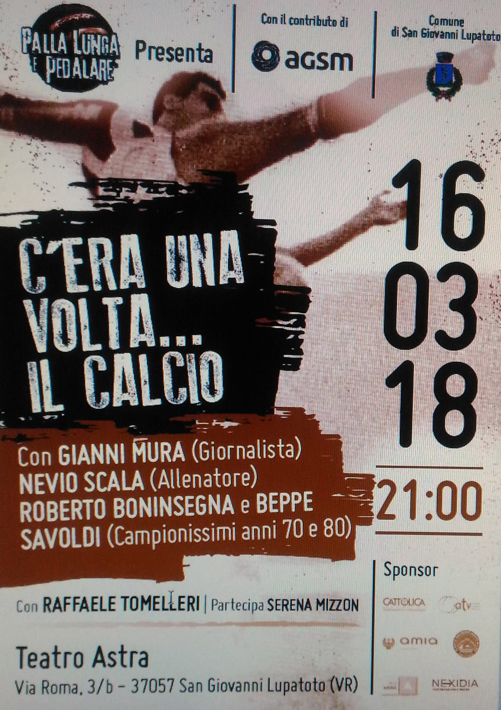 Venerdì 16 marzo, alle 21 al Teatro Astra di San Giovanni Lupatoto, va in scena il talk show di Palla lunga e pedalare, trasmissione andata in onda su TeleArena, che avrà quale tema ” C’era una volta il calcio”. Ospiti assolutamente d’eccezione