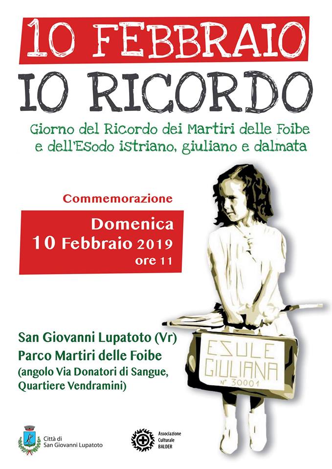 In occasione del Giorno del Ricordo, il giorno 10 febbraio 2019 alle ore 11, ci sarà la deposizione di una corona al Parco Martiri delle Foibe (nel quartiere Vendramini) con un minuto di silenzio per le vittime così a lungo dimenticate; la cerimonia è patrocinata dal Comune di San Giovanni Lupatoto e organizzata dall’Associazione Culturale Balder e saranno presenti le autorità.