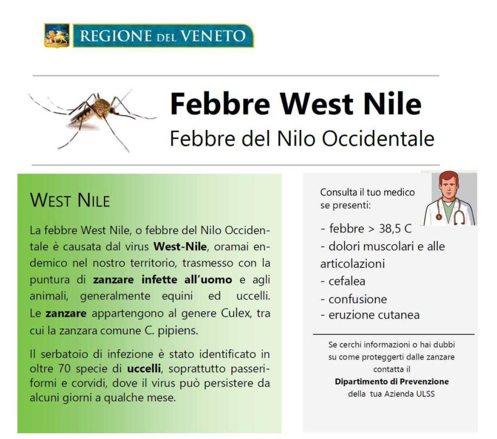L’Ulss9 ha invitato il Comune a non creare allarmismi bensì piuttosto a continuare con azioni informative rivolte alla cittadinanza sulle modalità corrette di protezione dalle punture degli insetti Vettori (zanzare) di West Nile. Le informazioni regionali per la prevenzione da puntura di zanzare si possono trovare anche sui social istituzionali e sulla pagina personale del Sindaco Attilio Gastaldello