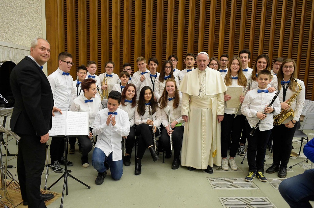 La Marconi Cotton Band, ha iniziato il nuovo anno con un importante incontro, la visita dal Santo Papa. Le musiciste e i musicisti, hanno vissuto l’emozione di suonare per Papa Francesco, mercoledì 8 febbraio nella bellissima Sala Nervi in occasione dell’udienza settimanale. Il pontefice ha accolto i ragazzi, ascoltando alcuni brani e ha speso con loro sorrisi e incoraggiamenti posando per le foto di rito.
