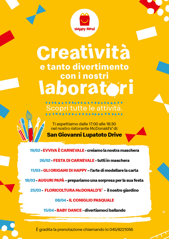 Proseguono i laboratori nel Ristorante McDonald’s di san Giovanni Lupatoto Drive, dalle 17 alle 18.30. Ecco il programma.