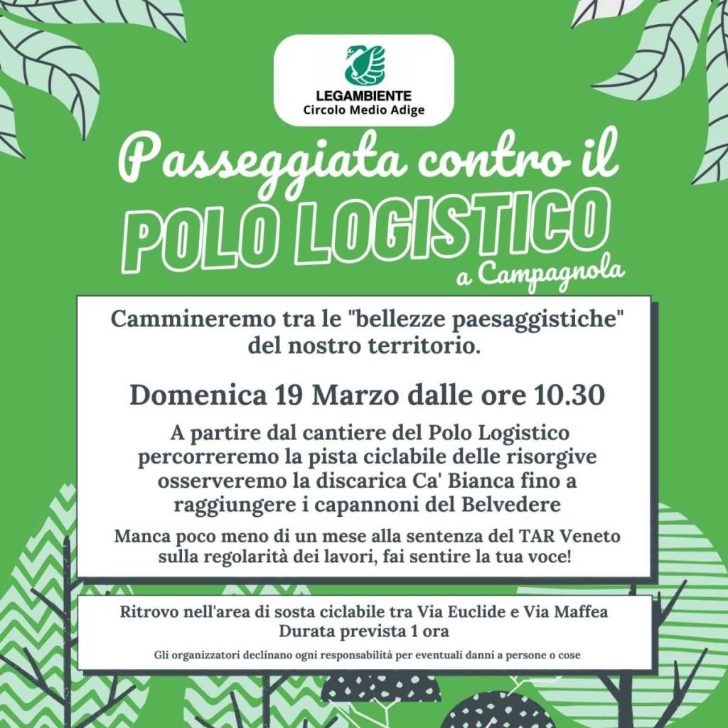 Il circolo Medio Adige di Legambiente ha organizzato per domenica 19 marzo un flash mob contro il polo logistico di Campagnola con partenza in bicicletta alle ore 10.30 dall’area di sosta ciclabile tra via Euclide e via Maffea. Durata prevista circa un’ ora. A partire dal polo logistico è previsto il passaggio davanti a Cà Bianca e ai capannoni del Belvedere. L’invito è di partecipare quando manca meno di un mese alla sentenza del Tar veneto sulla regolarità dei lavori.