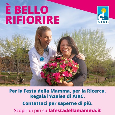 Azalea della Ricerca di Fondazione AIRC torna per la Festa della Mamma. Dopo un anno di assenza a causa dell’emergenza Covid, i volontari di AIRC Veneto – Trentino Alto Adige tornano nelle piazze per celebrare, quest’anno più che mai, l’impegno nella ricerca scientifica. Perché la Salute è il nostro bene più prezioso e il sostegno alla ricerca è il migliore investimento nel Futuro. Troverai i volontari di AIRC domenica 9 maggio, a partire dalle 8 di mattina a: San Giovanni Lupatoto in piazza Umberto I, davanti al Circolo Culturale; Zevio in piazza Toscana. Con una donazione di 15 euro riceverai in cambio una meravigliosa Azalea della Ricerca da regalare a tutte le mamme, anche a quelle che sognano di Domani. Scegliendo l’Azalea daremo infatti più forza ai 5.300 ricercatori AIRC impegnati a trovare le terapie più personalizzate e le cure sempre più efficaci per battere il cancro. Prenota subito la tua Azalea della Ricerca contattando un volontario AIRC o mandando un messaggio alla coordinatrice della zona al numero 391 3113703
