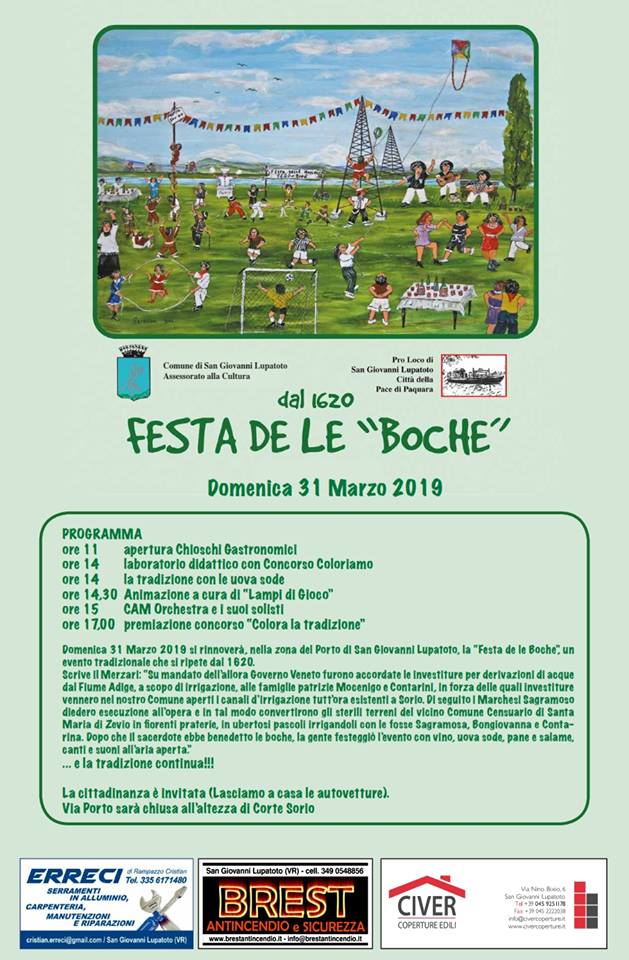 La “Festa de le boche” , la più antica tradizione popolare lupatotina si festeggerà domenica 31 marzo 2019. Come è noto l’evento ha radici ultracentenarie che risalgono ai primi del 1600 ed è legato alla realizzazione delle famose prese d’acqua dal fiume Adige, (“le boche”) che consentivano l’irrigazione dei terreni agricoli fin nella bassa veronese. I festeggiamenti dedicati alla grande opera idraulica sono diventati una solida tradizione locale giunta fino ai giorni nostri. La sua semplice formula , anche se attualizzata per certi aspetti, funziona ancora, in quanto, alla base di essa ci sono sempre i soliti genuini componenti, quali: la voglia di socializzare sull’erba, all’aria aperta, magari a contatto di amici e conoscenti, dove allegria, musica e giochi non mancano mai e tanto meno tavole imbandite di uova sode, stuzzichini e bottiglie di buon vino. L’apparato operativo e organizzativo della festa è stato curato della Pro Loco con il patrocinio del Comune lupatotino. Per conferire maggior impulso all’evento l’organizzazione ha pianificato un programma dettagliato. Per cui, in zona porto, già dalle ore 11.00, funzioneranno i chioschi gastronomici in supporto a coloro che per comodità preferiscono un pasto caldo al panino imbottito portato da casa. Dalle ore 14.00 in poi, verrà attivato un laboratorio didattico denominato : “Coloriamo la tradizione”, dove si insegnerà a decorare le uova sode come si faceva un tempo , e chi lo desidera , potrà partecipare al concorso per la miglior decorazione, la cui premiazione avverrà intorno alle ore 17.00. Il via alle esibizioni musicali, canore e i giochi di animazione avverrà intorno alle ore 14.30. Si confida ovviamente in una splendida giornata soleggiata di fine marzo , per il resto, ci penserà il contesto festaiolo a rallegrare gli animi. Come consueto i trasferimenti in riva all’Adige con mezzi motorizzati sono vietati. Una pedalata o quattro passi in compagnia potrebbero essere una buona alternativa.