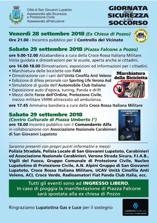 L’Amministrazione comunale di San Giovanni Lupatoto invita a conoscere da vicino chi ci protegge ed aiuta alla Giornata della Sicurezza e del Soccorso, che si terrà sabato 29 settembre 2018. La manifestazione è organizzata dal Comune – Assessorato alla Sicurezza e Protezione Civile e Assessorato all’Istruzione, vedrà la partecipazione delle Forze dell’Ordine, Corpi militari, Protezione Civile, Enti ed Associazioni che si occupano di sicurezza e soccorso.