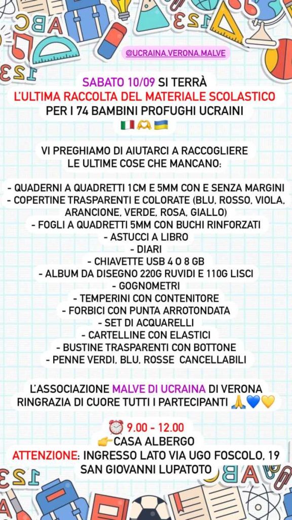 Sabato 10 settembre dalle 9 alle 12 in Casa Albergo, con ingresso dal lato via Ugo Foscolo 19, si terrà l’ultima raccolta di materiale scolastico per i bambini ucraini a cura dell’associazione Malve.