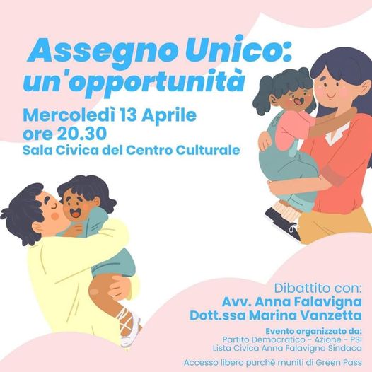 Dal 1° gennaio 2022, è possibile fare domanda per ricevere il nuovo assegno unico e universale ogni mese, per ogni figlio a carico.È universale perché tutti ne hanno diritto, indipendentemente dalla condizione lavorativa (occupati e disoccupati) e senza limite massimo di reddito.È possibile fare richiesta, per ogni figlio a carico, dal 7° mese di gravidanza fino ai 21 anni d’età.Vi aspettiamo mercoledì 13 aprile ore 20,30 alla Sala civica di San Giovanni Lupatoto, Piazza Umberto I n. 10, per conoscere di cosa si tratta e come fare domanda!