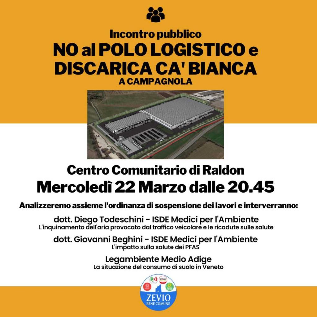Il Centro comunitario di Raldon ospita mercoledì 22 marzo alle 20.45 un incontro pubblico sul tema “ No al polo logistico e discarica di Cà Bianca” a Campagnola promosso da Zevio Bene Comune. Intervengono il dott. Diego Todeschini su “ L’inquinamento dell’aria provocato dal traffico veicolare e le ricadute sulla salute”, il Dott.  Giovanni Beghini su “ L’impatto sulla salute dei Pfas, Legambiente Medio Adige su “ Evoluzione del consumo di suolo in Veneto