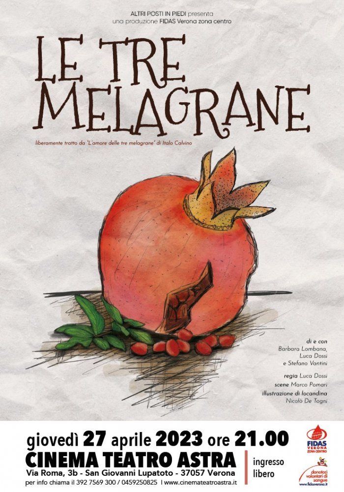Donare il sangue è una favola, da raccontare a grandi e piccini. Debutta giovedì 27 aprile alle 21, al Teatro Astra di San Giovanni Lupatoto (via Roma, 3b), lo spettacolo “Le tre melagrane”, liberamente tratto da “L’amore delle tre melagrane” di Italo Calvino. L’hanno commissionato alla compagnia “Altri posti in piedi” i donatori di sangue di Fidas Verona, a partire da un’idea della sezione di Pozzo, condivisa poi con le altre 27 sezioni della zona Centro. Lo spettacolo gode del patrocinio del Comune di San Giovanni Lupatoto.