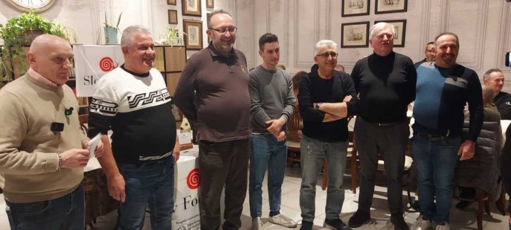 Il nome sembra derivare dalla forma leggermente ricurva che i salamini assumono appena insaccati; la caratteristica del prodotto è legata inoltre all’utilizzo di parti nobili del maiale nell’impasto, (spalla, lombo, culaccia, prosciutto e grasso di pancetta) e alla speziatura con aglio macerato in vino bianco. Nella foto i sei finalisti con il fiduciario della Condotta Slow Food Valli Grandi Veronesi Luca Faggioni , primo a sinistra.