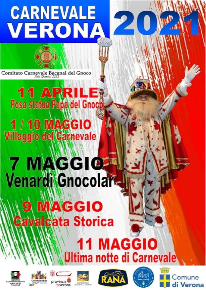 Il 7 maggio, con la tradizionale sfilata di carri, Verona festeggerà per le vie cittadine il venerdì gnocolar. Nella mattinata, il papà del Gnoco, accompagnato dalle principali maschere della tradizione, si incontrerà con Presidente della Provincia, Prefetto e Sindaco. Dalle 13.45, con avvio da corso Porta Nuova, partenza del corteo. Domenica 9 maggio, alle ore 14, Cavalcata storica di Can Francesco della Scala. Martedì 11 maggio, ore 19.30, ultimo di carnevale con festa in maschera in Gran Guardia. La sfilata notturna dei carri, invece, si terrà sabato 29 maggio, a partire dalle ore 20. Sabato 11 settembre, alle ore 19.30 in piazza San Zeno, evento di chiusura del Carnevale con il ‘Maccheronicum convivio Gnocolarum’.