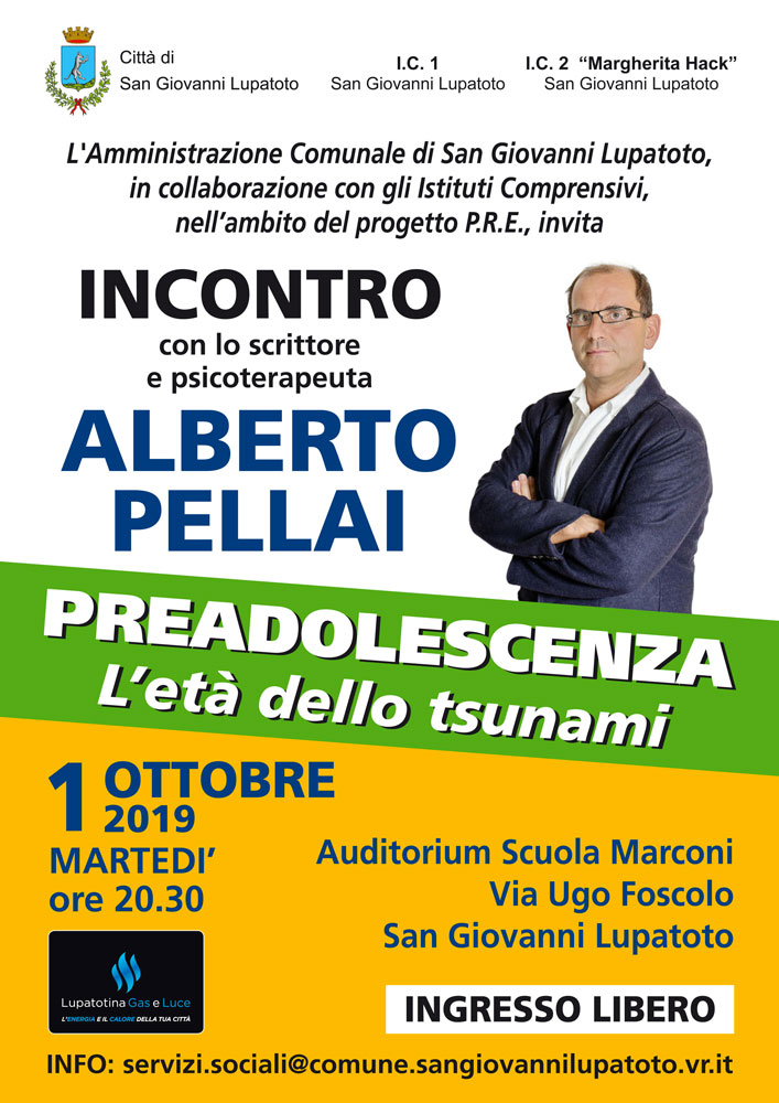 Preadolescenza o l’età dello tsunami, dal titolo di un suo libro, sarà l’argomento dell’incontro pubblico col prof. Alberto Pellai che si terrà martedì I° ottobre 2019 alle ore 20.30 presso l’auditorium delle scuole Marconi di via Foscolo a San Giovanni Lupatoto, organizzato dall’Amministrazione Comunale in collaborazione con gli Istituti Comprensivi 1 e 2.
