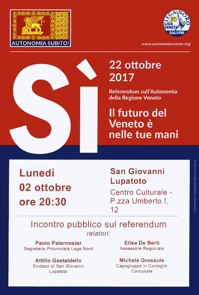 Il Centro culturale di Piazza Umberto I n. 10 ospita lunedì 2 ottobre, alle 20.30, un incontro pubblico sul referendum che si terrà domenica 22 ottobre. Relatori Paolo Paternoster, segretario provinciale della lega Nord, l’assessore regionale Elisa De Berti, il sindaco di San Giovanni Lupatoto Attilio Gastaldello ed il capogruppo consiliare della Lega Nord Michele Grossule.