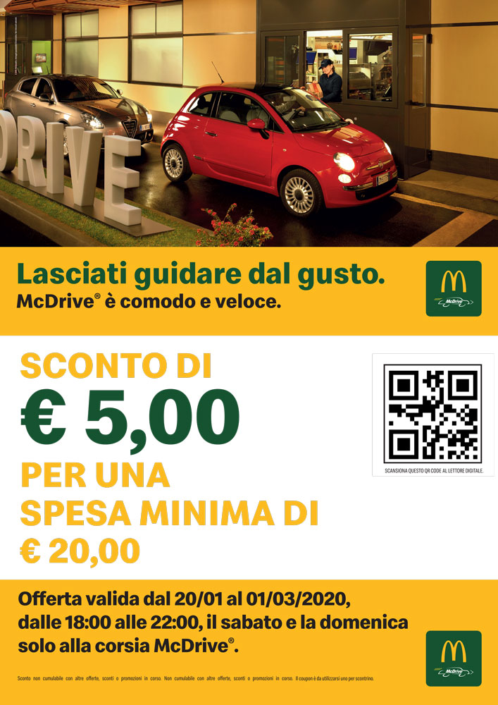 Al McDrive di San Giovanni Lupatoto in via Cà Nova Zampieri sconto di 5 euro per una spesa minima di 20 euro. Offerta valida dal 20 gennaio fino al primo marzo 2020, dalle 18 alle 22, il sabato e la domenica.