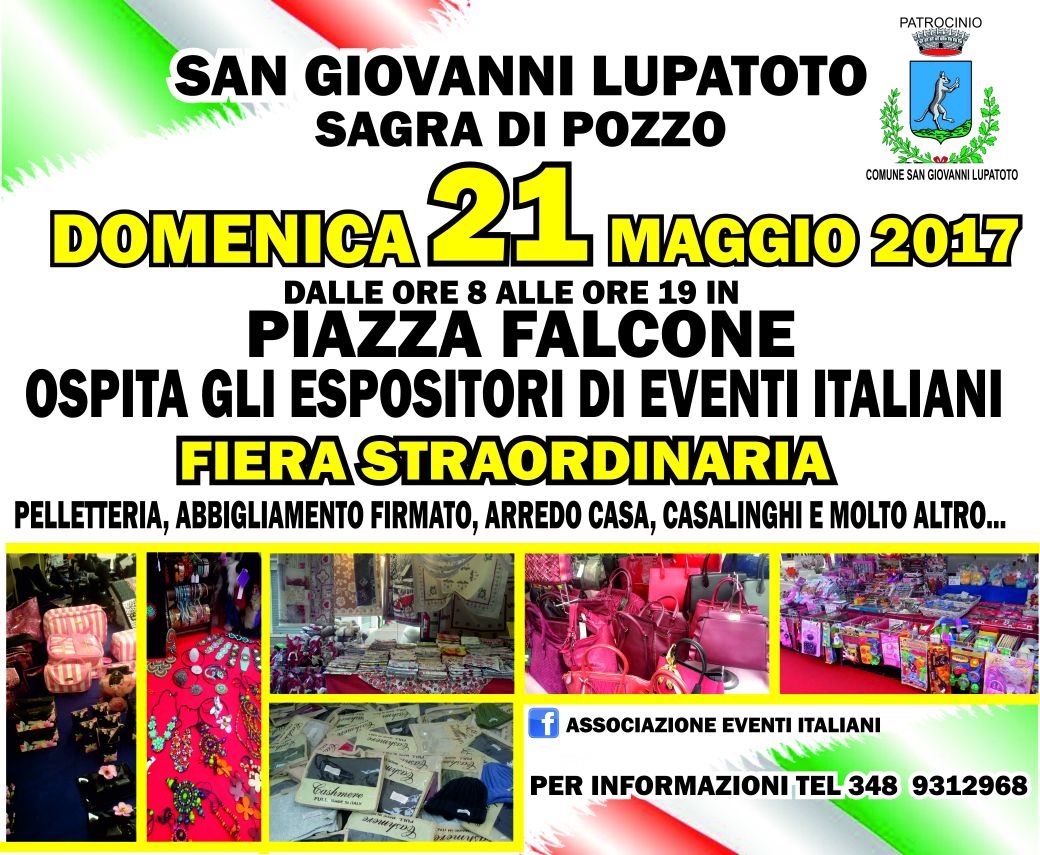 Domenica 21 Maggio, con il patrocinio dell’ Assessorato alla Cultura del Comune di San Giovanni Lupatoto e l’organizzazione di Luca Rebonato, si terrà in Piazza Falcone a Pozzo la manifestazione che promuoverà il Made in Italy. Trenta banchetti saranno presenti nella piazza con oggettistica varia ed abbigliamento prodotti esclusivamente sul territorio nazionale. Il consigliere con la delega della frazione di Pozzo, Davide Bimbato:” Come Amministrazione Comunale abbiamo deciso che in occasione della Sagra di Primavera, in programma da Venerdi 19 Maggio al Martedi 23 Maggio a Pozzo, di arricchire per la prima volta un appuntamento annuale di così importanza per la frazione con un esposizione di 30 banchetti tutti prodotti Made in Italy provenienti da tutta Italia. Ringraziamo Luca Rebonato, Silvano Ferrari e tutto il Comitato della Sagra per la preziosa collaborazione .” Bimbato conclude:” Un punto importante del nostro Programma amministrativo è la rivitalizzazione di Piazza Falcone e della frazione, siamo convinti che con la collaborazione delle associazioni locali e dei commercianti stessi si possono raggiungere obiettivi importanti.”