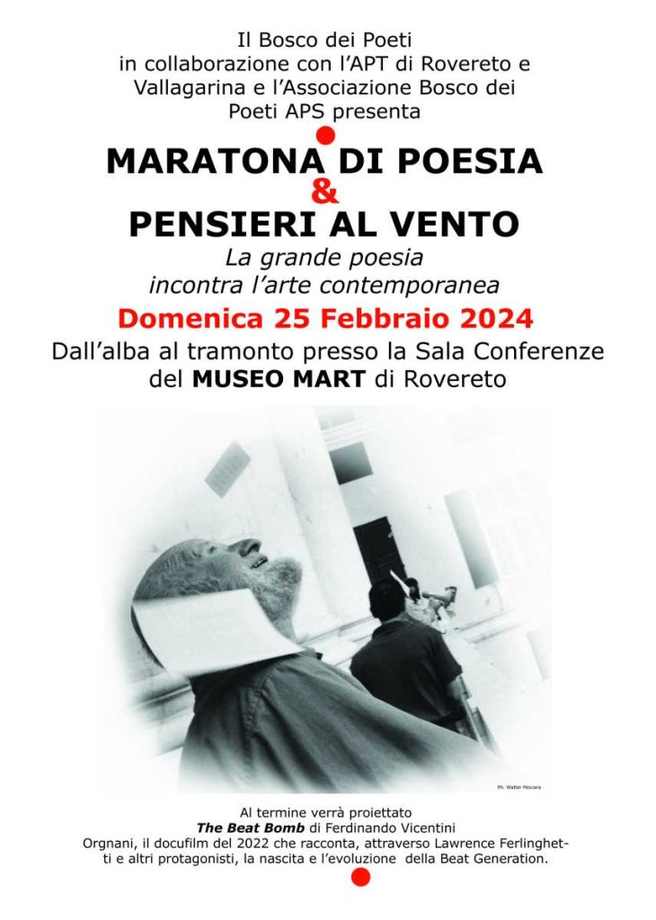 Domenica 25 febbraio, grande “Maratona di Poesia” al Museo di arte moderna e contemporanea di Trento e Rovereto. Nella Sala Conferenze del Mart Rovereto si alterneranno una ventina di poeti, principalmente trentini, veneti e lombardi; nei piani del museo sarà esposta la raccolta “Pensieri al Vento” che 33 artisti internazionali hanno realizzato per il Bosco dei Poeti. Al termine verrà proiettato il docufilm The Beat Bomb di Ferdinando Vicentini Orgnani. Il film di genere documentario del 2022 racconta, attraverso Lawrence Ferlinghetti e altri protagonisti della Beat Generation, la nascita e l’evoluzione del movimento e dei suoi protagonisti.