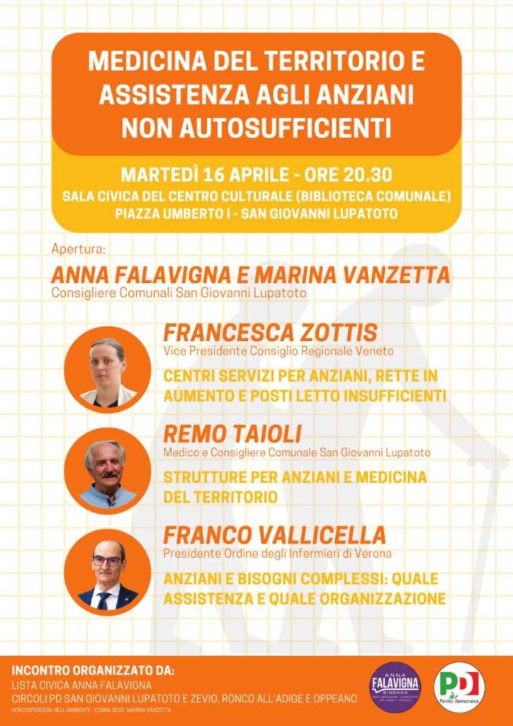 Interverranno Francesca Zottis Vice Presidente del Consiglio Regionale Veneto, su Centri servizi per anziani, rette in aumento e posti letto insufficienti,Remo Taioli Medico e Consigliere Comunale San Giovanni Lupatoto, su Strutture per anziani e medicina del territorio, Franco Vallicella Presidente dell’Ordine degli Infermieri di Verona su Anziani e bisogni complessi, quale assistenza e quale organizzazione.