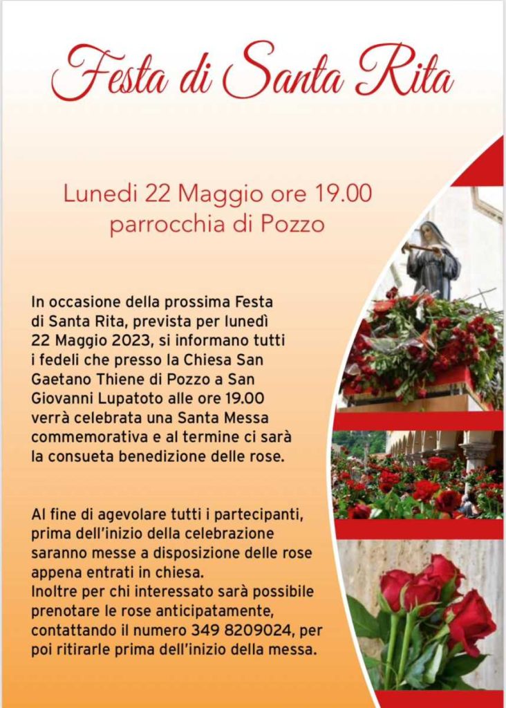 In occasione della Festa di Santa Rita, prevista per lunedì 22 maggio 2023, si informano tutti i fedeli che presso la Chiesa di San Gaetano Thiene di Pozzo a San Giovanni Lupatoto, alle ore 19 verrà celebrata una Santa Messa commemorativa , con la partecipazione del Vescovo Giuseppe Zenti, mentre al termine ci sarà la consueta benedizione della rose. Al fine di agevolare tutti i partecipanti, prima dell’inizio della partecipazione saranno messe a disposizione delle rose appena entrati in Chiesa. Inoltre per chi interessato sarà possibile prenotare le rose anticipatamente contattando il numero 349/ 8209024 per poi ritirarle prima dell’inizio della messa.