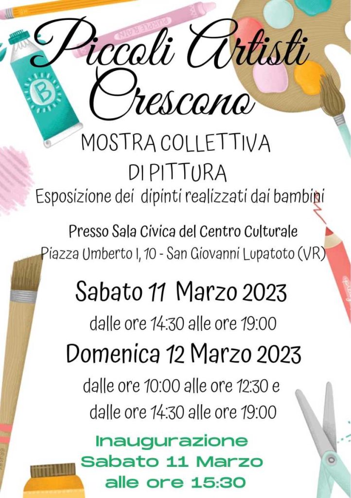 Sabato 11 e Domenica 12 Marzo 2023 si terrà presso la Sala Civica del Centro Culturale la prima mostra collettiva per bambini e ragazzi.Tutte le opere esposte sono state realizzate dai bambini di età compresa tra i 4 e i 18 anni, ognuno in base alle proprie capacità relative all’età ma tutti di sicuro con tanta voglia di imparare.La mostra è aperta Sabato 11 Marzo dalle 14:30 alle 19 e Domenica 12 Marzo dalle 10:00 alle 12:30 e dalle 14:30 alle 19:00Sabato 11 Marzo 2023 alle ore 15:30 si terrà l’inaugurazione!