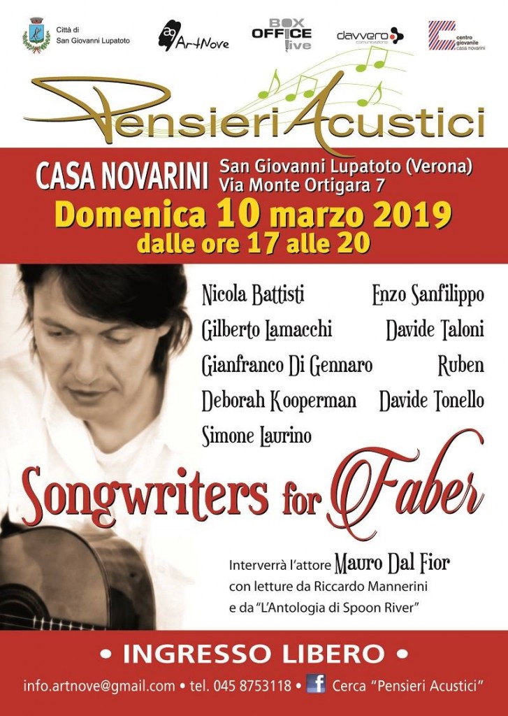 La rassegna, organizzata dall’associazione ArtNove con la collaborazione di Davvero Comunicazione e di Verona Box Office Live, gode del patrocinio del Comune di San Giovanni Lupatoto, e non poteva non iniziare con un tributo a Fabrizio De Andrè, di cui è da poco ricorso il ventennale della prematura scomparsa. Quindi domenica 10 marzo alcuni cantautori, veronesi e non, si uniranno per rendere omaggio al grande Fabrizio De André.