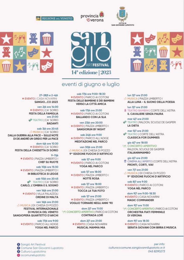 Un cartellone con settanta eventi e con la prima Notte Rosa. L’estate lupatotina accende grazie alla quattordicesima edizione del SanGiò Art Festival, la rassegna culturale estiva promossa dall’Amministrazione comunale, con il patrocinio della Provincia e della Regione Veneto, per trascorrere l’estate in città all’insegna dell’allegria e dell’aggregazione per condividere suoni, sapori e colori. Con i diversi appuntamenti in programma, infatti, l’Amministrazione intende valorizzare il territorio e le sue associazioni culturali, offrendo a giovani e famiglie un palinsesto di eventi per vivere insieme l’arte, la musica, il cinema, il teatro e molto altro.