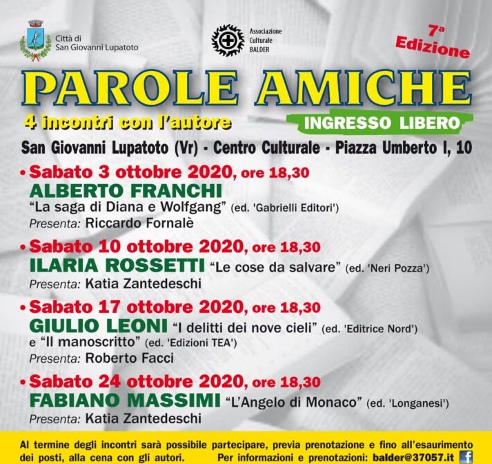 ‘Parole Amiche’ è la rassegna in quattro incontri con l’autore, giunta alla settima edizione, organizzata dall’associazione culturale Balder con il patrocinio dell’assessorato alla cultura del Comune di San Giovanni Lupatoto.