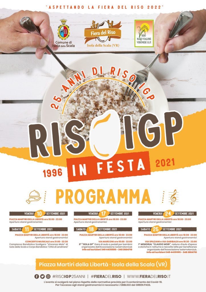 Venerdì 10, sabato 11, il 17 e 18, il 24 e il 25 settembre il Comune di Isola della Scala insieme all’Ente Fiera e al Consorzio di Tutela della I.G.P. Riso Nano Vialone Veronese promuovono RISO IGP IN FESTA.Le tipicità del territorio s’incontrano in Piazza dei Martini della libertà, seguiti da eventi come il complesso bandistico scaligero “Vincenzo Mela” di Isola della Scala e del Corpo Bandistico “Città di Lendinara” sabato 11 settembre, il quinto Gran Premio auto a pedali, la gara d’auto per bambini organizzata dall’Associazione Isolamotorclub in programma sabato 18 settembre. Il 25 settembre si terrà il 1° MEMORIAL “CLAUDIO MORI, il raduno d’auto d’epoca e classiche in notturna e raccolta del latte per beneficenza organizzato dall’Associazione Isolamotorclub. “Abbiamo voluto dare un segnale importante al nostro pubblico che ci segue da più di cinquant’anni – commenta l’avv. Michele Filippi, amministratore unico di Ente Fiera Isola della Scala. – Insieme all’amministrazione, al Consorzio Riso Nano Vialone Veronese IGP, abbiamo deciso di tener viva l’attenzione con gli eventi che si svolgeranno in questi weekend. Quest’anno, per ragioni di sicurezza abbiamo deciso di spostare l’evento in piazza, dando risalto al venticinquesimo anniversario del riconoscimento europeo del riso nano vialone veronese IGP. Come Ente Fiera siamo già al lavoro per preparare la prossima edizione della kermesse che vedrà l’iscrizione all’interno del calendario dell’Associazione AEFI, Associazione Espositori e Fiere Italiane e darà un respiro internazionale alla manifestazione”. “In questo anno particolare segnato dalla pandemia, è importante non smarrire la strada e non perdere la fiducia, che fonda le sue radici nella straordinaria esperienza dei cittadini Isolani che si è fatta tradizione. In attesa del 2022, che sarà certamente prosperoso, manteniamo alta l’attenzione degli appassionati della cucina isolana qui ad Isola della Scala – precisa il primo cittadino Stefano Canazza. – Insieme all’Ente Fiera e al Consorzio abbiamo deciso di promuovere l’iniziativa denominata RISO IGP IN FESTA, per poter dare la possibilità a tutti coloro che lo vorranno, di degustare i risotti e le tipicità della cucina in tutta sicurezza”. La manifestazione si svolgerà all’aperto, nelle piazze del centro paese e sarà necessario essere muniti di green pass per accedere agli stand. “Abbiamo accolto la proposta con grande entusiasmo – conclude il presidente del Consorzio Leoni – i nostri associati si sono resi disponibili per portare le eccellenze culinarie in piazza”. Sarà possibile degustare i risotti e la polenta con la stortina con un ticket a 10 euro.