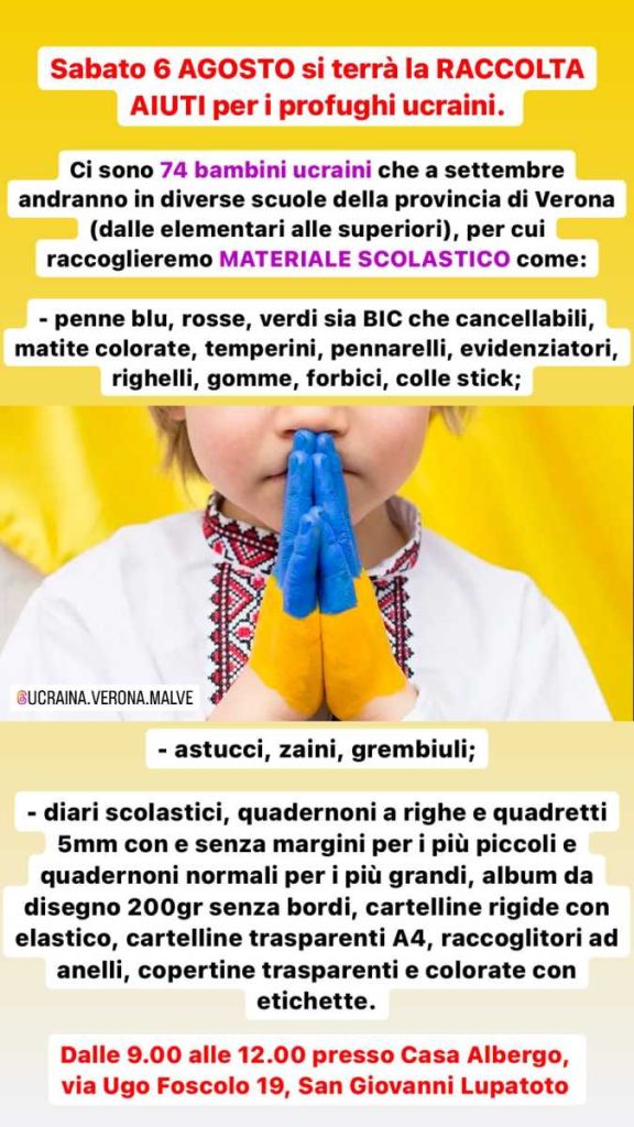Sabato 6 agosto è in programma, dalle 9 alle 12 presso la Casa Albergo in via Ugo Foscolo, la raccolta di materiale scolasstico per 74 studenti ucraini che a settembre frequenteranno le nostre scuole, dalle elementari alle superiori.