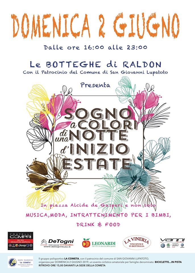 Organizzata dalle Botteghe di Raldon, si tiene domenica 2 giugno> Organizzata dalle botteghe di Raldon, in Piazza De Gasperi dalle 16 alle 23, la seconda edizione con il tema dei colori. Presenti per l’occasione il nercatino di hobbisti,intrattenimento per i bimbi (gonfiabili e molto altro),cabaret e animazione bimbi by shock events., dimostrazioni crossfit Mastino, Drink e food, Moda , sfilata della banda “Arrigo botto” con concerto sul sagrato della chiesa alle 16,00.Al bar centrale dj pennello, alla Cave des Vins live dei “Drivewheel”.