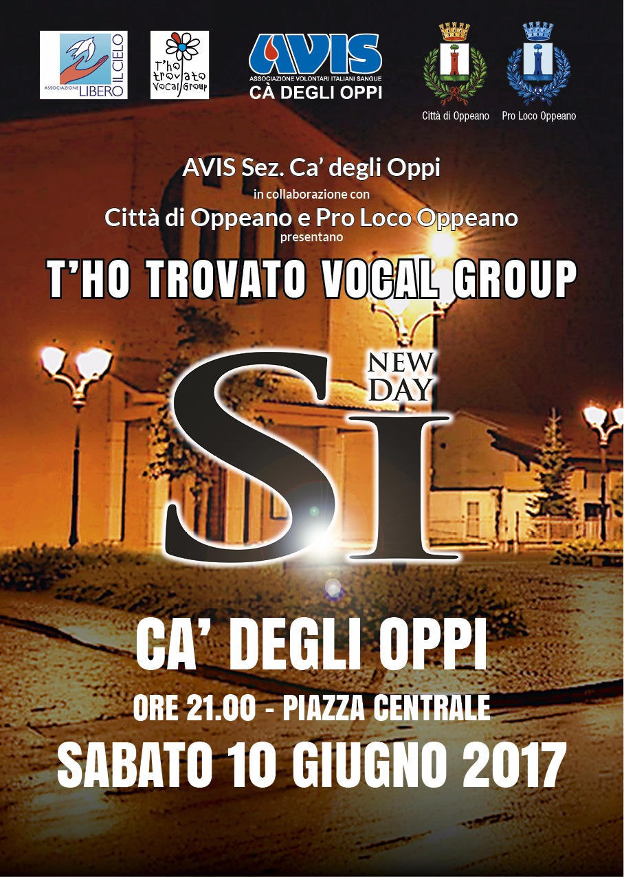 Avis di Ca’ degli Oppi, col patrocinio di Città di Oppeano e Pro Loco di Oppeano, assieme all’associaizone Libera il Cielo, presenta T’Ho trovato Vocal Group, sabato 10 giugno p.v. nel giardino adiacente alla Chiesa parrocchiale di Ca’ degli Oppi.