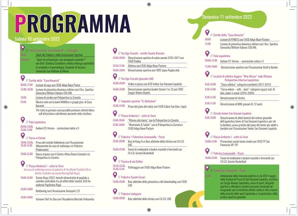 Sabato 10 e domenica 11 settembre è in programma a San Giovanni Lupatoto un week end per promuovere le tante discipline sportive locali. A Casa Novarini si inizia con un incontro dedicato anche alla salute con il Prof. Gianluca Castellarin, medico chirurgo specialista in ortopedia e traumatologia; mentre nel giardino si susseguono, per l’intero weekend, lezioni gratuite di: yoga, ginnastica militare zumba e con dimostrazione tecnica ai calistenici. Sotto la Torre, sempre dalle ore 9:00 si presentano le altre associazioni sportive. Nel parcheggio della Lidl, saranno allestiti due campi per basket e volley. Presso l’impianto calcistico Battistoni i più piccoli potranno sperimentarsi nel gioco del calcio sotto la guida di tecnici esperti, mentre al PalaLupatotina saranno organizzate partite e dimostrazioni del calcio a 5 e di basket. Tornei di minibasket e dimostrazioni di Kung Fu potranno invece essere seguite presso la palestra Leoncavallo. Presso il giardino della scuola Marconi ci sarà il rugby. La serata di sabato si concluderà, presso Casa Novarini, alle ore 21:00 con l’esibizione di band musicali e, presso il Parco ai Cotoni, dalle ore 19:00 alle ore 21:00 con la danza. Domenica, sotto la Torre sarà il momento delle arti marziali e del tennis tavolo. Presso l’impianto Nino Mozzo, si alterneranno l’atletica leggera, la ritmica e il bmx per la categoria esordienti e allievi mentre nel vicino circolo di tennis, saranno disponibili dimostrazioni e prove per tutti. Domenica, alle ore 11:00, si procederà all’intitolazione della palestra di via Leoncavallo al Prof. Sergio Bonato, lupatotino, uomo di sport, dirigente sportivo e allenatore, nonché assessore comunale ed insegnante, per la meritoria attività svolta a favore della crescita dello sport lupatotino.