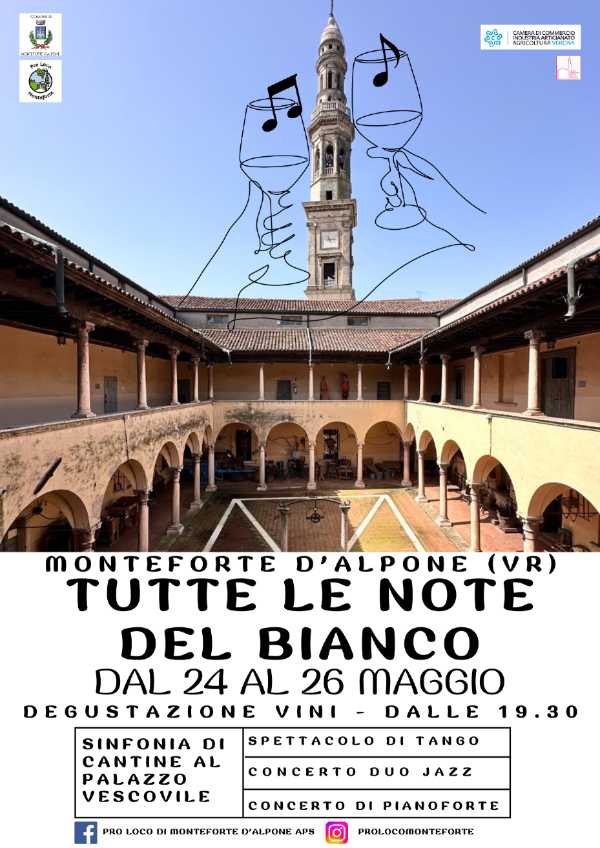 La Pro Loco di Monteforte d’Alpone è lieta di annunciare l’evento “Tutte le Note del Bianco”, un’incantevole rassegna che unisce il fascino del vino alla magia della musica, in programma da giovedì 23 a domenica 26 maggio presso il suggestivo Palazzo Vescovile.