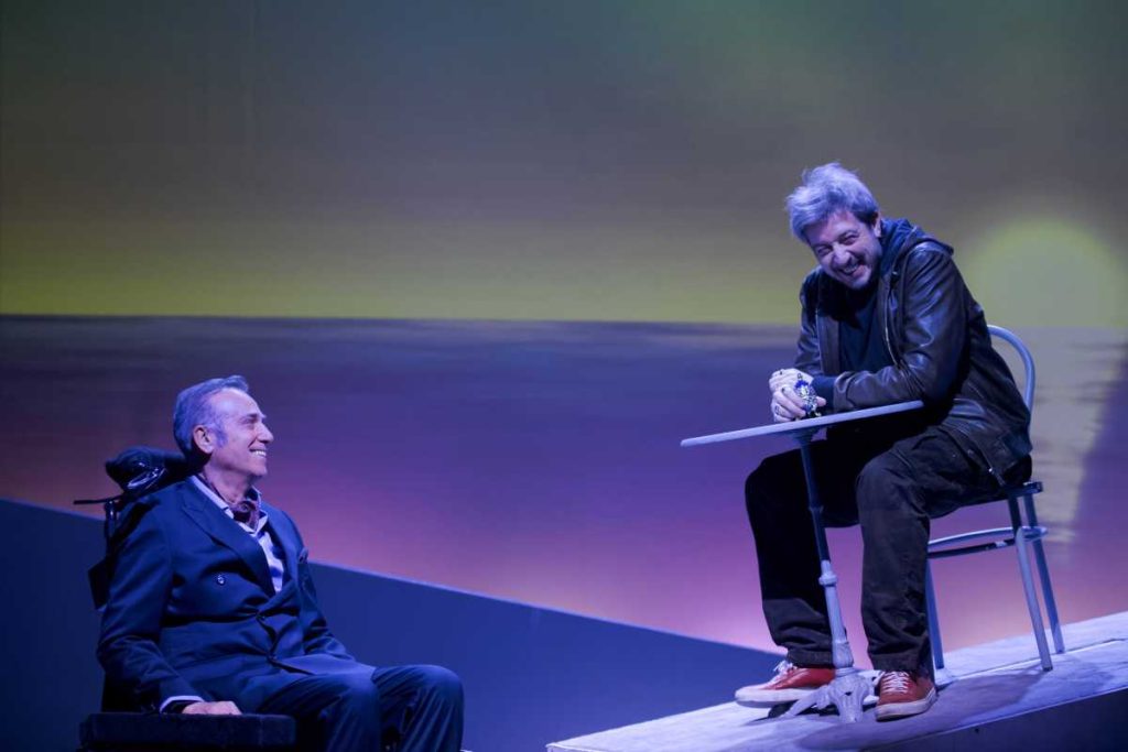 Lo spettacolo è tratto dal film “Intouchables” (Quasi amici) di Éric Toledano e Olivier Nakache del 2011 ispirato a una storia vera. Nei cinema d’Oltralpe è stato il secondo film francese con i maggiori incassi di tutti i tempi. In Italia il film francese di maggior successo negli ultimi decenni. I “quasi amici” sono due uomini che nonostante siano agli antipodi su tutto, hanno una smodata voglia di ridere e di prendersi in giro. Philippe (Ghini) è un miliardario paraplegico, Driss (Ruffini) è uno che tira avanti con sussidi statali e si barcamena come può nella vita. Giochi del destino, Driss risponde a un annuncio di lavoro di Philippe che sta cercando un caregiver. Più che per farsi assumere, a Driss interessa farsi firmare un foglio che attesti l’avvenuto colloquio e gli permetta di continuare a riscuotere i sussidi statali. Philippe, positivamente colpito da Driss, decide invece di assumerlo. «Da una parte – dice il regista – un uomo molto agiato, intelligente, affascinante e che vive di cultura. Un uomo che il destino ha voluto relegare a solo cervello facendolo precipitare con il parapendio. Dall’altra un uomo che entra ed esce di galera, con una sua intelligenza vivace e una cultura fatta sulla strada. Un uomo che preferisce porre il suo corpo avanti a tutto e lasciare il cervello quieto nelle retrovie. Un predatore che in realtà è una preda delle proprie debolezze. Due uomini talmente diversi da costituire una teorizzazione dell’antimateria. Due particelle che potrebbero portare a un’esplosione, a un annichilimento delle proprie personalità. Avviene invece il miracolo: questi due uomini finiranno col diventare inseparabili».