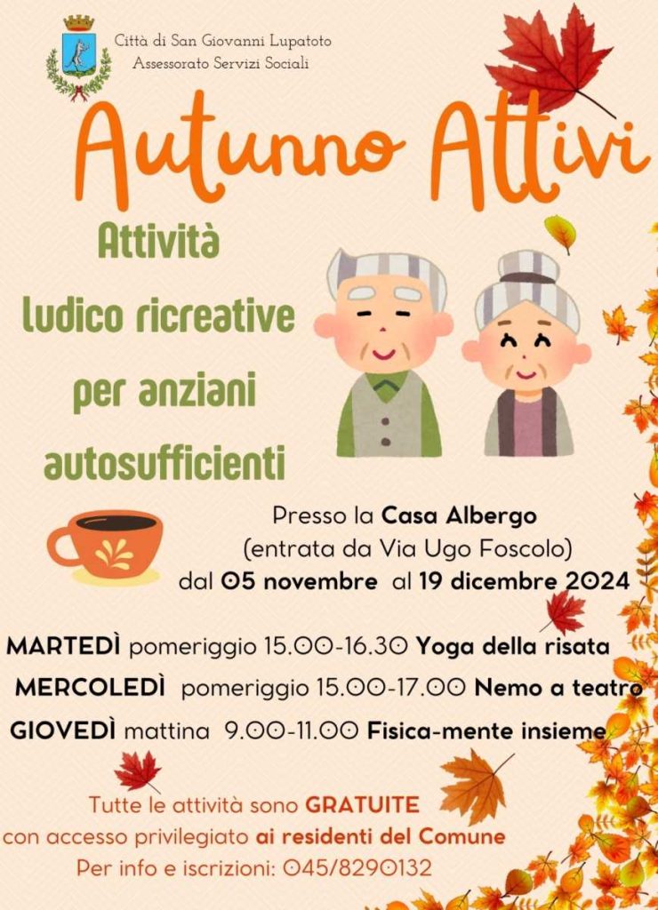. L’Amministrazione comunale, su proposta dell’assessorato al Sociale, dà il via al progetto “Autunno Attivi” che propone delle attività ludico ricreative e di stimolazione cognitiva per persone anziane autosufficienti durante il periodo autunnale, offrendo inoltre la possibilità di favorire momenti di socializzazione.