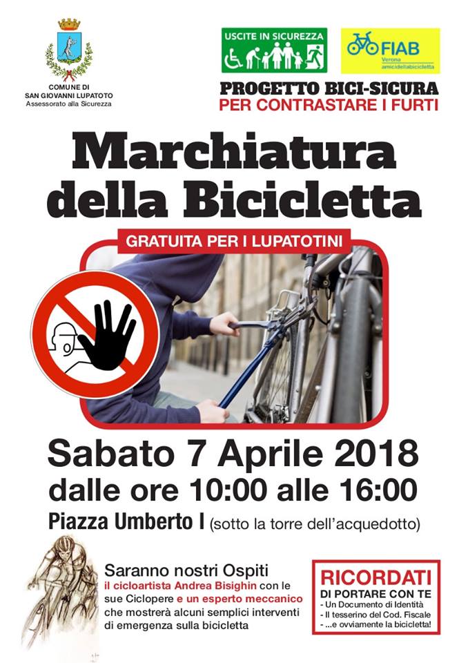L’Amministrazione comunale, in collaborazione con FIAB Verona – Federazione Italiana Amici della Bicicletta, propone “Bici Sicura” per contrastare i furti di biciclette e per supportare l’uso in sicurezza della bicicletta. Il primo appuntamento si terrà sabato 7 aprile 2018, dalle ore 10,00 alle 16,00, in Piazza Umberto I sotto la torre o, in caso di maltempo, presso il Centro Culturale; durante l’incontro i cittadini potranno marchiare gratuitamente le loro biciclette e ricevere consigli utili sulla sicurezza stradale.