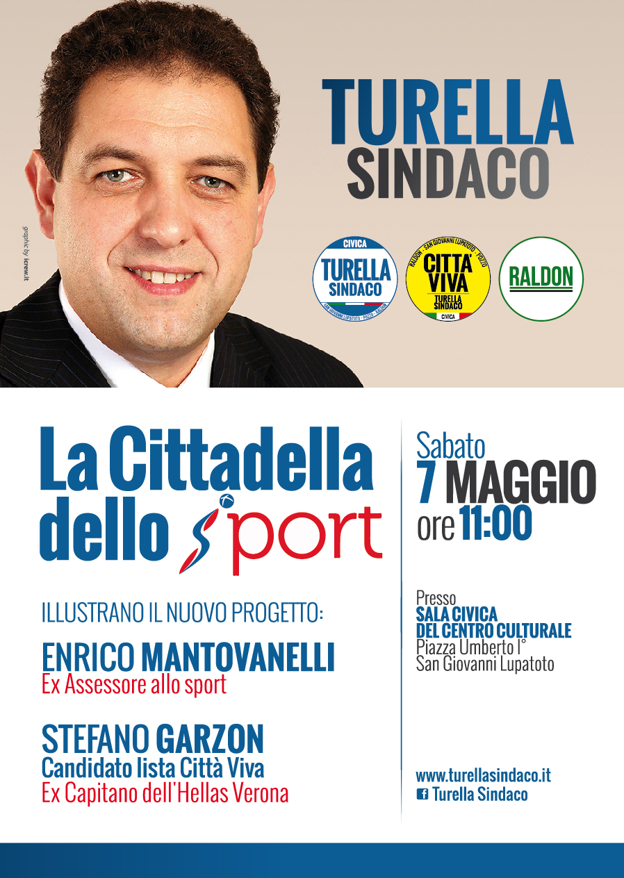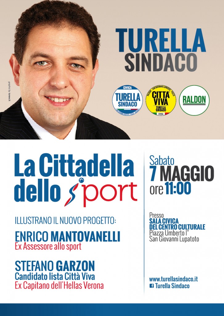 “Siamo “Città europea dello sport” e vogliamo una città dove lo sport sia alla portata di tutti. Il cuore sportivo Lupatotino si identifica negli impianti di viale Olimpia” afferma il candidato Sindaco Daniele Turella. “Se ne parla da parecchio tempo” prosegue Turella “ma noi perseguiamo la strada tracciata dall’ ex assessore Enrico Mantovanelli, che senza ombra di dubbio, ha dato una marcia in più allo sport lupatotino nel periodo in cui ha operato, mettendo in luce San Giovanni Lupatoto, in tutta la provincia”. “Per questo”, prosegue Turella, “vogliamo dar seguito ai suoi progetti sportivi, realizzando la “Cittadella dello Sport” che prevede nuovi impianti sportivi, l’ eliminazione dei confini e delle barriere tra le varie strutture che saranno collegate intensamente da percorsi pedonali e percorsi fitness”.