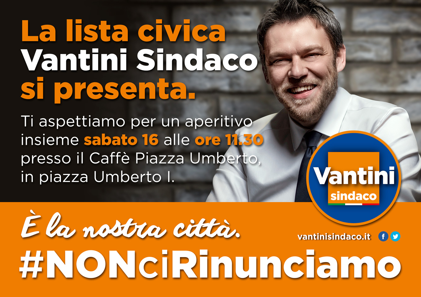 Questo fine settimana è in programma la presentazione della Lista Civica Vantini sindaco e dei suoi componenti, a sostegno del Candidato Sindaco Federico Vantini per le amministrative 2016 del comune di San Giovanni Lupatoto.La conferenza si terrà sabato 16 Aprile, alle ore 11.30, presso il locale Caffè Piazza Umberto, in piazza Umberto I a San Giovanni Lupatoto