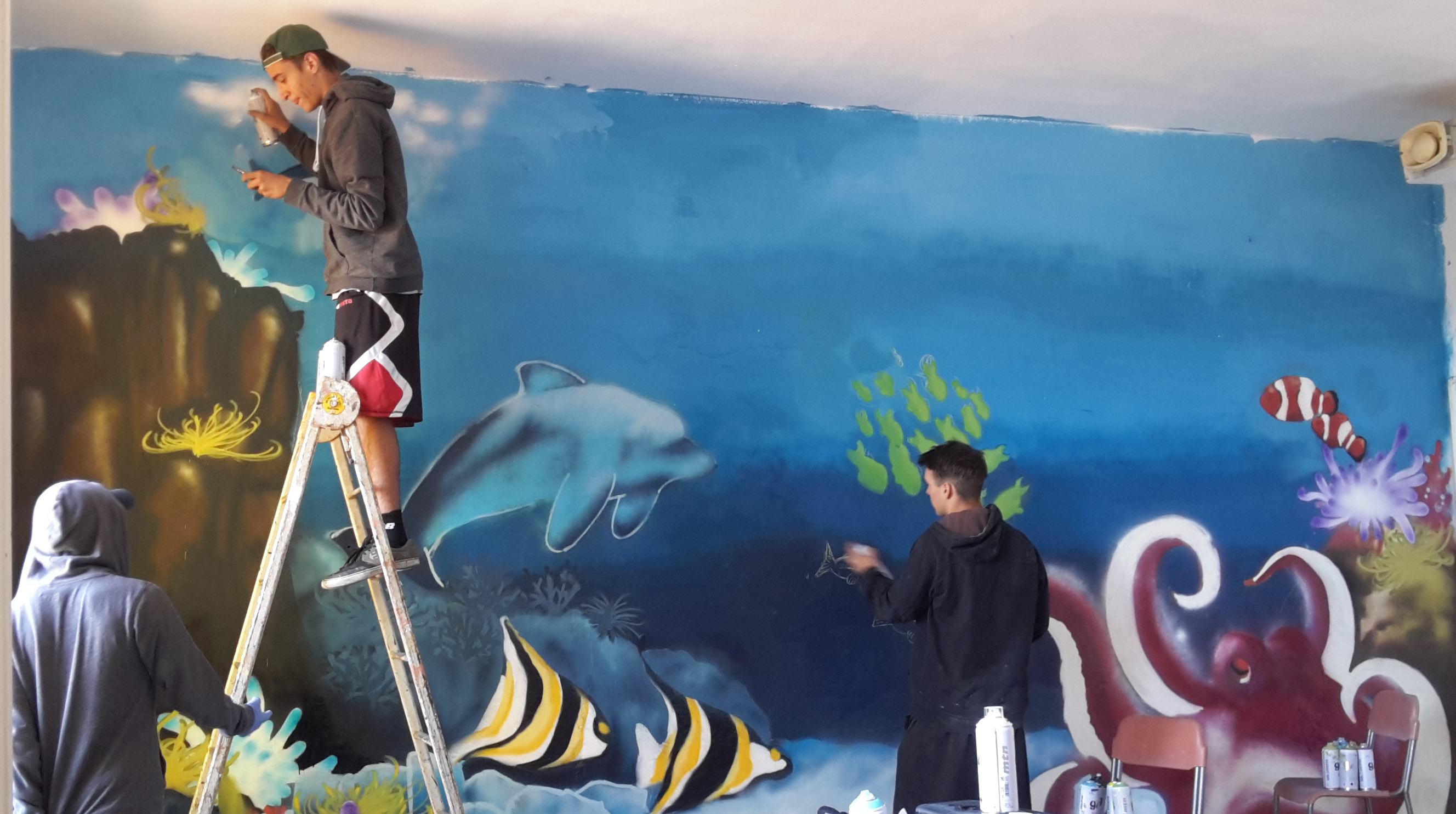 Ma cosa sta succedendo nella casa dei campi scuola di Prun? C’è un laboratorio di artisti che stanno portando in montagna un enorme acquario… che farebbe invidia anche al grande acquario di Genova. Si sta formando un’enorme barriera corallina con pesci, delfini e uno squalo che si avvicina dall’orizzonte… la luce del sole fa brillare il fondale cristallino… una creazione in 3D bellissima, realistica e sensazionale. Mattia: siamo stati onorati per la sfida laciataci dal don, perché pochi ci danno la possibilità di fare cose belle… Filippo: siamo un bel gruppo e tanti di noi non hanno questa possibilità di poter fare cose belle… dobbiamo esercitarci nelle nostre cantine e sulla carta…, purtroppo molti imbrattano in modo sciocco, rovinandoci la possibilità di esprimere queste opere d’arte che siamo capaci di creare. Francesco: è strafigo che un don si preoccupi di sviluppare le nostre capacità, e ci dia lo spazio dove è possibile per crescere nella nostra arte, ma lo fa anche con gli sport minori, come gli sport a rotelle. Ci viene a scovare dove ci troviamo, e a suo modo cerca distare con noi e ci sta! Andrea: queste esperienze vissute in comunità parrocchiale mi danno la possibilità di imparare ad usare la bomboletta e con il consiglio dei miei amici, imparando e scoprendo quello che ho nel cuore, è proprio una bella esperienza imparare da chi è bravo, mi sembra di essere in una bottega medioevale di arte, con i maestri e i garzoni. Questo gruppo di ragazzi Mattia, Andrea, Filippo e Francesco, appassionati di Street-Art, si dedicano al Writing negli spazi della parrocchia di Gesù Buon Pastore, e osservando, ammirando e seguendo i Writers di San Giovanni Pablo e altri, crescono in bravura qualità. Accogliendo la sfida di don Michele sulla crescita qualitativa della propria arte, il gruppo di ragazzi, con l’aiuto dei propri maestri e aiutando i meno bravi ad imparare, stanno creando una vera compagnia di artisti. È un movimento artistico che si sta sviluppando nel nostro territorio in modo importante. Fondamentale è accompagnare questi artisti a crescere e dare spazi per il loro sviluppo. Alla parrocchia del Buon Pastore c’è un fermento artistico in pieno sviluppo, la popolazione beneficia delle belle opere d’arte che questi ragazzi creano, si sta ampliando la creazione artistica anche all’interno del parco giochi… dopo i bellissimi BENVENUTI in tutte le lingue del mondo, sta esplodendo la bellezza e la gioia espressa dai ragazzi… il bello è che si stanno creando compagnie che si divertono. Questi ragazzi, dice don Michele, hanno bisogno di essere ascoltati e chiedono di essere accompagnati nelle loro passioni e è importante il riconoscimento pubblico per una efficace educazione della modalità di espressione del Writing. Già il comune si sta muovendo in questo, speriamo che vengano concessi richiestissimi muri di libero writing… con le regolamentazione già concordate con il comune, proposte nelle richieste già protocollate. Inauguriamo il grande murales con la partecipazione ai campi fatti a Prun.